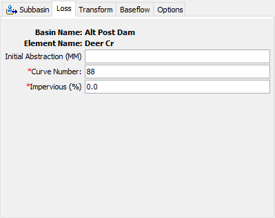 Parámetros: requiere ingresar un Número de Curva (CN) compuesto y el porcentaje de área impermeable conectada directamente en la subcuenca.