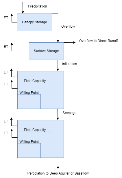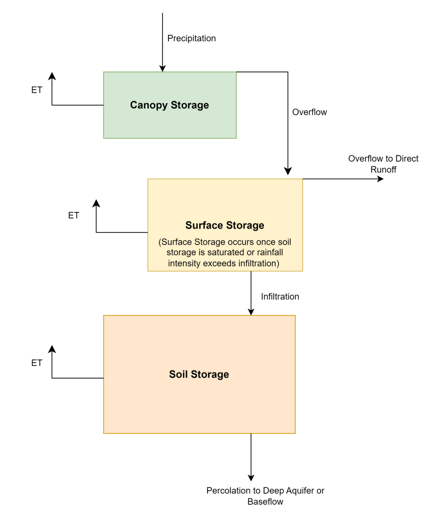 Durante la lluvia, primero se llena la intercepción de dosel (canopy); al saturarse, el exceso va a la depresión superficial hasta llenarla; de allí, el exceso se infiltra en la zona de suelo hasta su capacidad. El suelo se divide en zona superior (rápida, drena tanto a ET como a percolación) y zona de tensión (agua fuertemente retenida, solo sale por ET lenta). Cuando la capacidad de campo del suelo se excede, el agua percola al acuífero 1 (superficial). Ese acuífero puede a su vez saturarse y derramar al acuífero 2 (profundo) o descargar lateralmente como baseflow del primer acuífero. El acuífero 2 únicamente pierde agua por percolación profunda (considerada pérdida total, recarga de agua subterránea no modelada) o como un segundo flujo base si se habilita un drenaje del acuífero 2.
