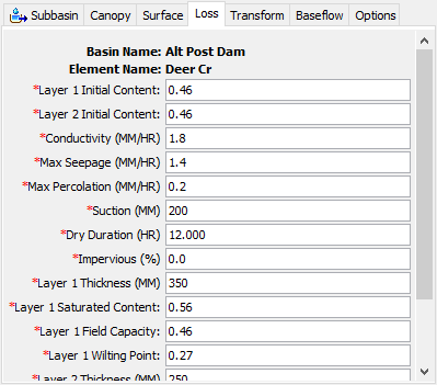 Parámetros: por su naturaleza, este método requiere bastantes parámetros. En HEC-HMS se configuran valores de almacenamiento y tasas para cada capa. En resumen se necesitan: porcentaje de llenado inicial de cada capa (suelo, acuífero 1, acuífero 2), la infiltración máxima desde superficie a suelo (mm/h), el % de área impermeable conectada, la capacidad máxima de almacenamiento en el suelo (mm), la capacidad de tensión dentro del suelo (mm que no drenan por gravedad), la tasa máxima de percolación del suelo a acuífero 1 (mm/h), la capacidad máxima del acuífero 1 (mm), la tasa máxima de percolación de acuífero 1 a acuífero 2 (mm/h), el coeficiente del acuífero 1 (hrs, controla la descarga lineal baseflow del acuífero 1), la capacidad máxima del acuífero 2 (mm), la tasa máxima de percolación de acuífero 2 a profundidad (mm/h) y el coeficiente del acuífero 2 (hrs, para flujo base del acuífero 2). En total son alrededor de 12 parámetros clave.