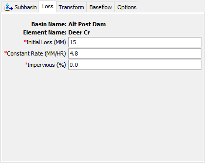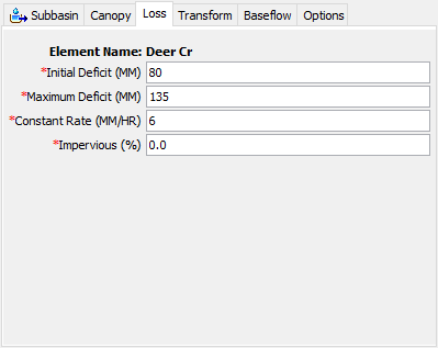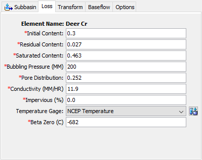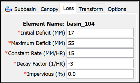 Parámetros: HEC-HMS requiere varios coeficientes que definen la curva de infiltración exponencial: la profundidad de ajuste inicial DLTKR (initial range) (mm) que representa la lámina infiltrada inicial durante la cual aumenta la tasa de infiltración, el coeficiente inicial STRKR (initial coef), el coeficiente de razón (ratio de decaimiento) y el exponente de precipitación ERAIN.