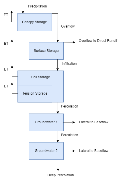 Es esencialmente un modelo de balance hídrico conceptual similar al del modelo Sacramento (SAC-SMA) del Servicio Meteorológico (original de Leavesley et al., 1983). Representa la cuenca como una serie de compartimentos de almacenamiento conectados: intercepción en copas, almacenamiento en superficie, perfil de suelo (zona superior y zona de tensión), acuífero superior y acuífero inferior profundo. Cada compartimento tiene una capacidad máxima y reglas de entrada/salida (infiltración, percolación, evapotranspiración, flujo subterráneo lateral).