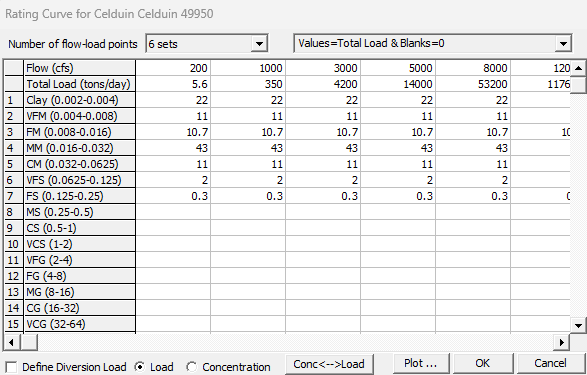 - Rating Curve: vincula la carga de sedimento con el caudal de entrada. El usuario define pares caudal–carga (o caudal–concentración) que se interpolan durante la simulación. Para flujos superiores al máximo definido, HEC‑RAS usa el valor más alto; para flujos inferiores extrapola asumiendo carga cero a caudal cero.