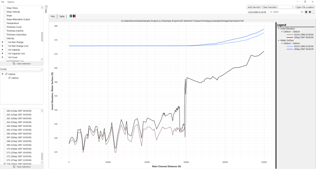 - Series de profundidad y nivel: se pueden ver los niveles de agua en cada sección y el volumen o masa acumulada de sedimento transportado. El programa exporta los resultados a archivos HDF5, DSS o formatos clásicos, lo que permite analizarlos externamente.