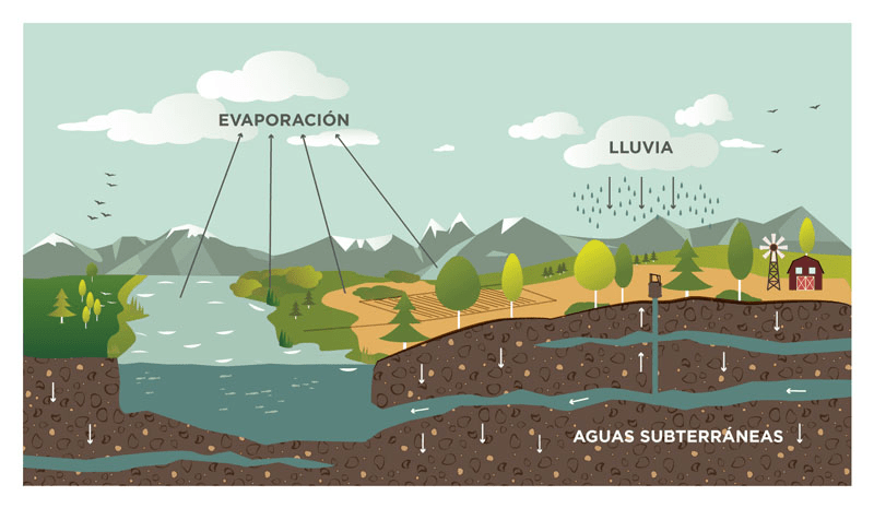 La lluvia que se infiltra en el suelo recarga los acuíferos y se convierte en agua subterránea. Esta agua subterránea se mueve lentamente bajo tierra siguiendo el gradiente hidráulico (de zonas altas hacia zonas bajas) y, con el tiempo, alimenta a ríos, lagos y océanos al descargar en ellos. Esta contribución sostenida se denomina flujo base o caudal de base de los ríos. Durante los periodos sin lluvias, el flujo base mantiene las corrientes activas; en épocas secas, muchos ríos dependen completamente de la descarga de acuíferos para no secarse.